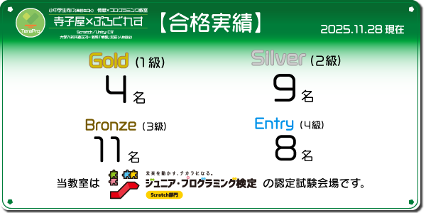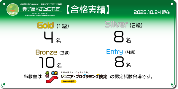 独自開発テキストは、ジュニア・プログラミング検定の検定級に対応しています。寺子屋×ぷろぐれすは、本検定の試験会場として認定されており、ジュニア・プログラミング検定模擬問題集を出版する、まなびファクトリーの代表兼寺子屋×ぷろぐれす教室長が育成した、講師指導のもと、安心して受験することが出来ます(受験は任意)。