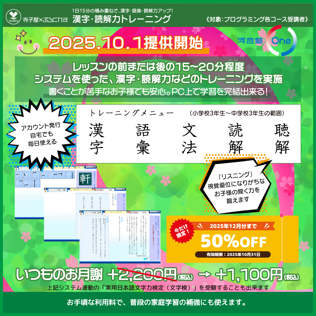 プログラミングコース受講者を対象に、漢字・読解力トレーニングの提供を開始😮