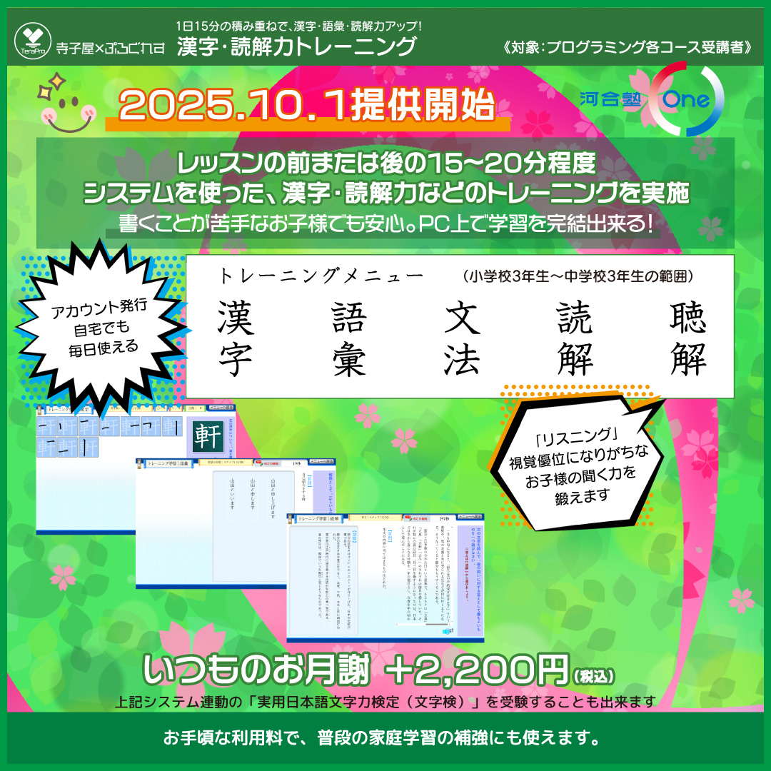 プログラミングコースは、基礎基本をしっかり学ぶ「Scratchコース」と、2D/3Dアプリを作りながら学ぶ、テキスト言語C#を含む「Unityコース」の2つ。さらに、プログラミングと相性の良い「算数・数学」を+Plusできる、算数+Plus、数学+Plusがパワーアップ!して登場。45分と70分から選べます。そして、2025年10月より導入、河合塾Oneを利用した「漢字・読解力トレーニング」をプラスすることも可能です💪